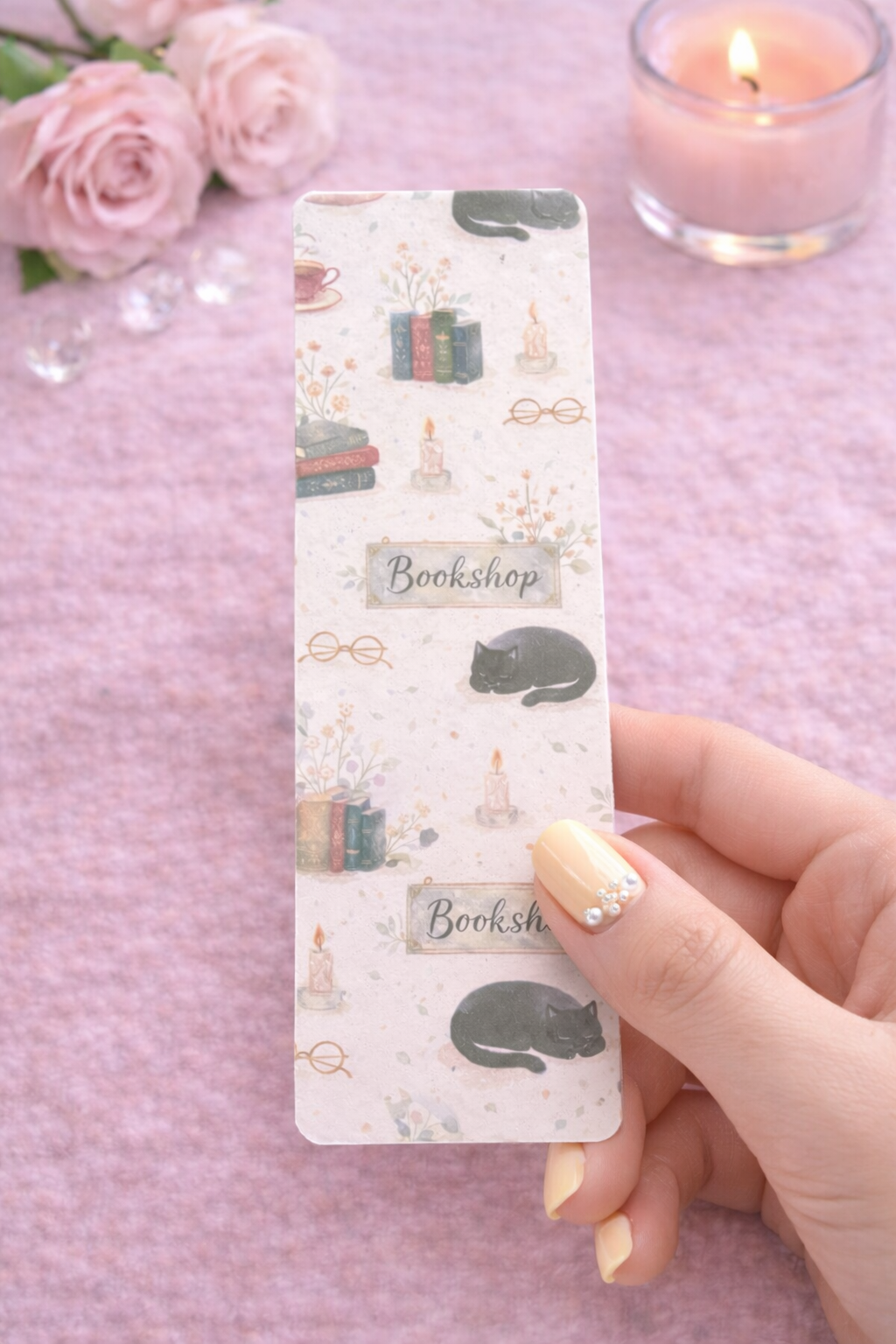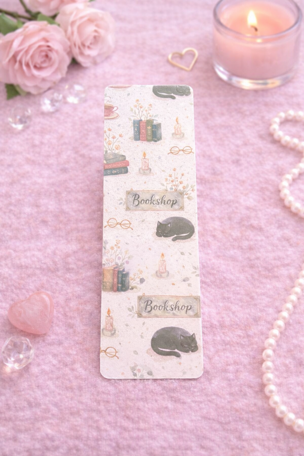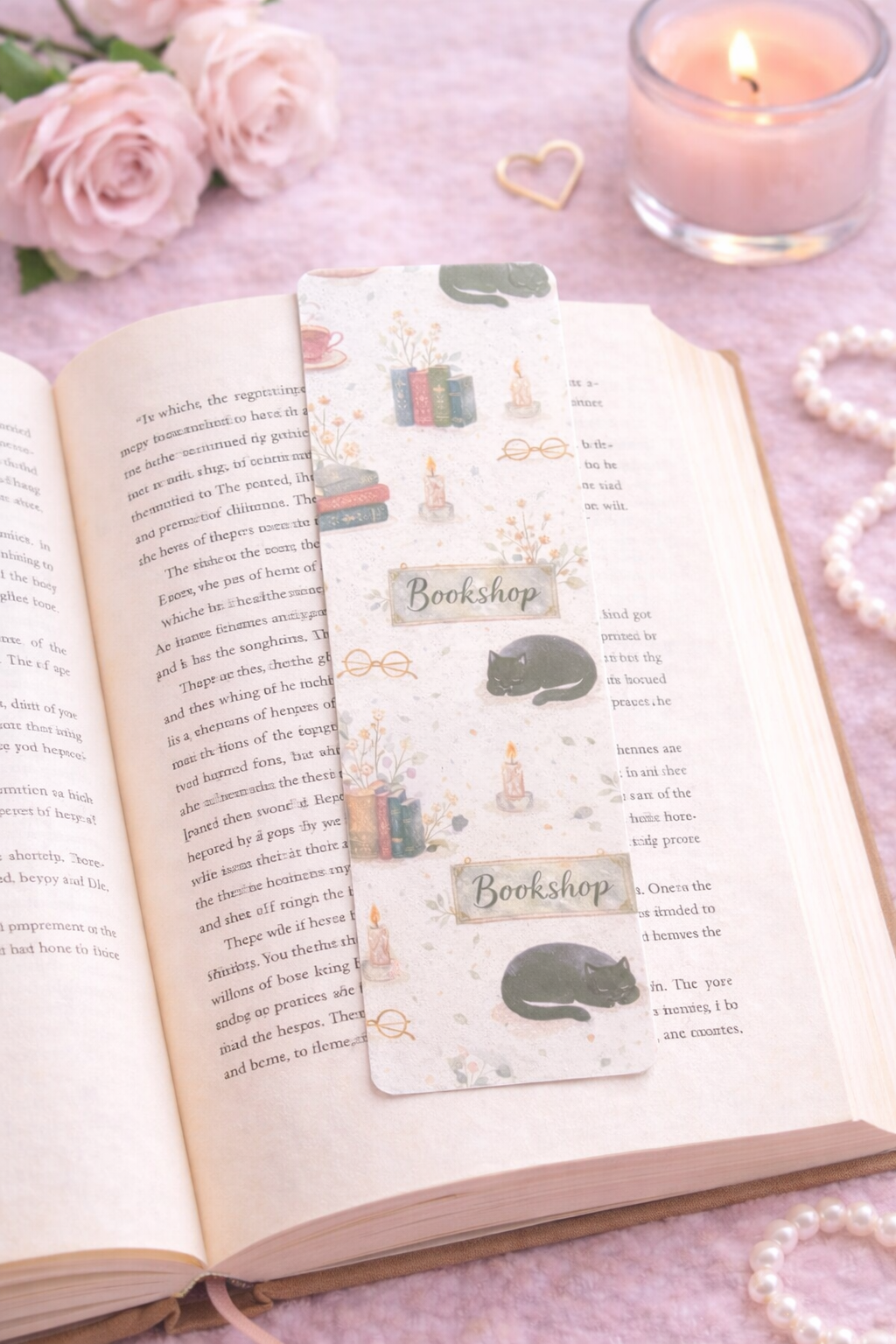 Plonge dans l’ambiance chaleureuse d’une librairie cosy avec ce marque-page illustré de livres, bougies et d’un adorable chat endormi.
